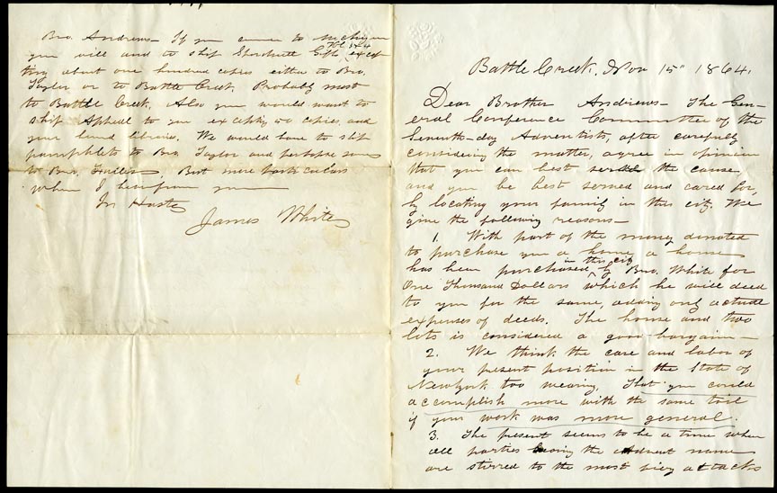 Letter from James White and others at the General Conference to John Andrews at Rochester, New York, November 15, 1864, asking him to relocate to Church headquarters at Battle Creek, Michigan. They felt his abilities were needed to address certain theological challenges to the new denomination.