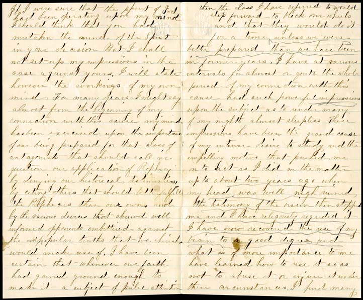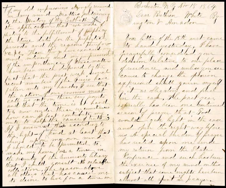 Letter from John Andrews to James White and the General Conference Committee members in Battle Creek, November 18, 1864. In this letter Andrews suggests he can be of more help to the denomination through access to the theological library available to him in Rochester. He is working on revising his History of the Sabbath to make it less likely to be attacked by skeptics. He is willing to relocate to Battle Creek if that is what the Brethren want, but he would like to stay in Rochester for the time being.